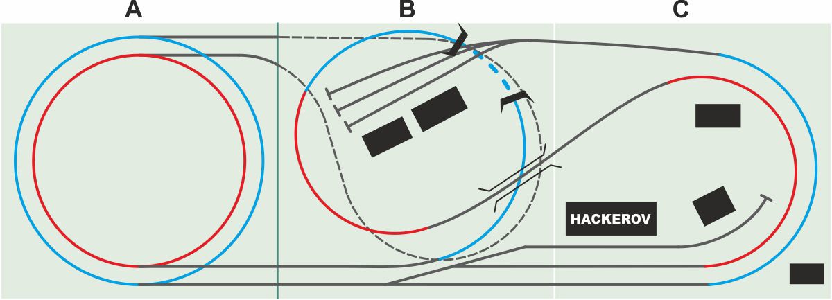 Basic track diagram. We chose the H0 scale. For such a scheme, three modules (A, B, C) 1000x1000mm are suitable.
