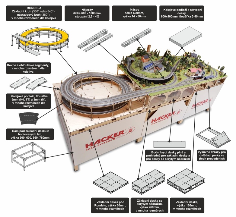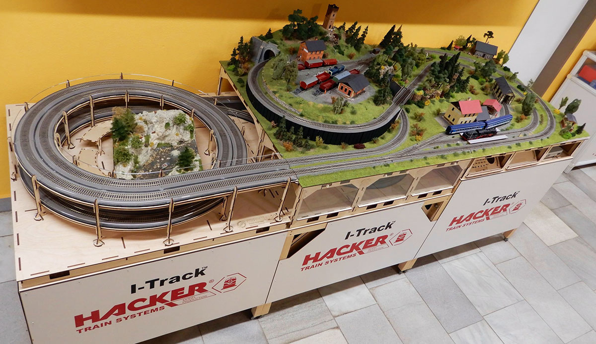 A Rondela is built on top of the A module to connect the lower and upper levels. The height difference between A and B is 200mm. The I-Track Rondelas are designed to overcome this height difference at any scale (H0, TT, N) while maintaining a suitable track gradient. Only the number of turns of the Rondel is selected according to the scale. In H0 scale, the assembly comes out at 1.5 circles. On module B, the track can be laid both on the bottom (hidden station) and of course on the top surface. Module C is a simple space plate, which can accommodate e.g. electronic track equipment, or depending on the type also pull-out holders for switches, tablet and other controls.