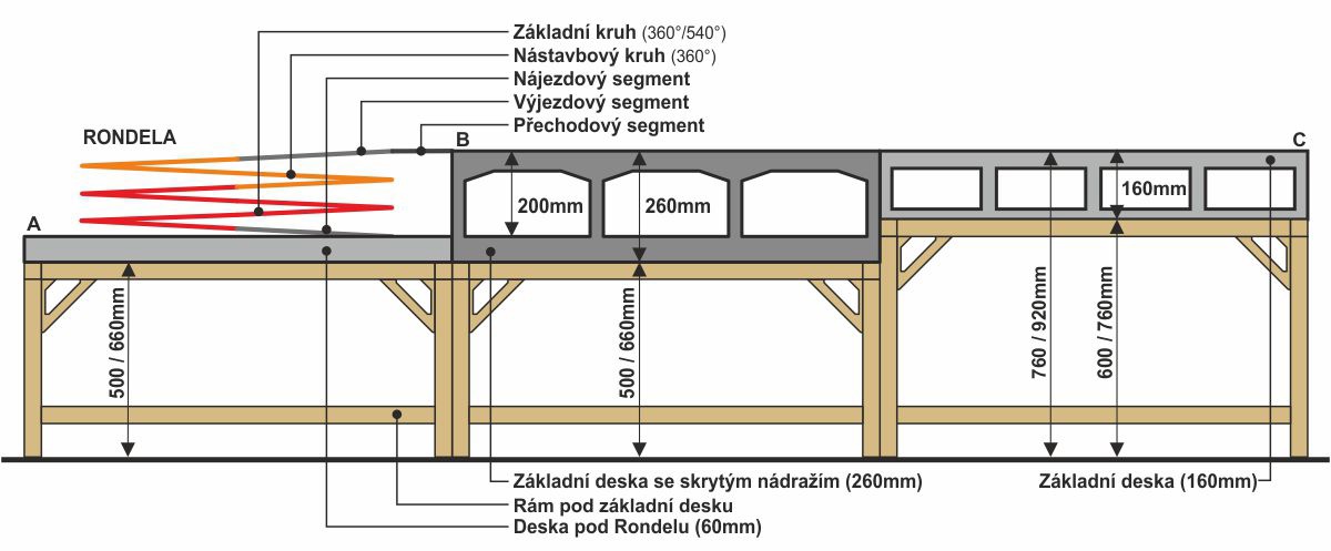 Height arrangement. Our track was designed to demonstrate the basic capabilities of the I-Track system. For this we chose a combination of three different base plates. A - a base plate under the Rondela with a height of 60mm and B - a base plate with a hidden station with a height of 260mm, which are mounted on frames of the same height, e.g. 660mm, and attached to them on a higher frame (760mm) is C - a base plate with a height of 160mm.