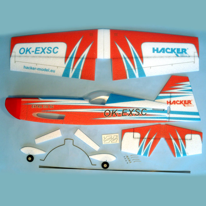 Obsahuje: Trup, křídlo, výškovku a směrovku s kvalitním barevným potiskem, podvozek, kola, uhlíkové výztuhy a táhla, veškeré drobné příslušenství, návod.