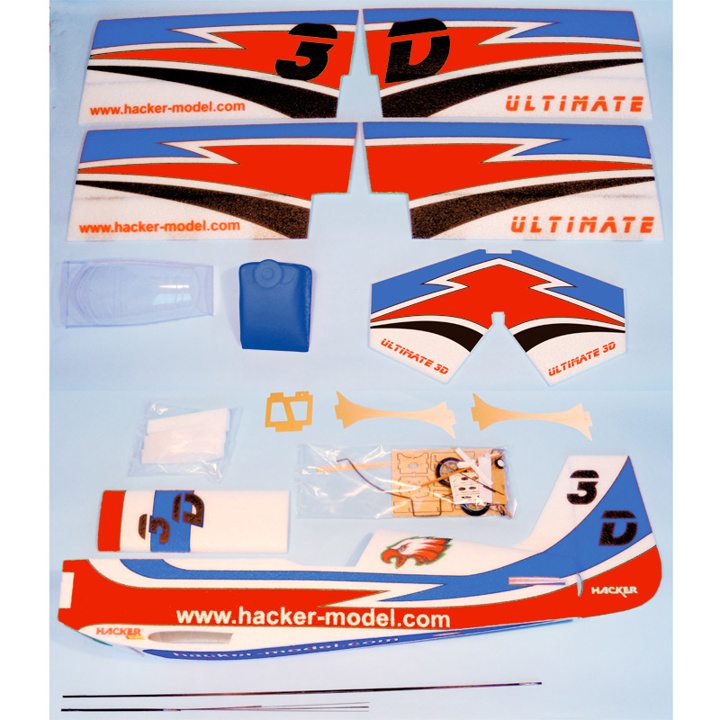 Obsahuje: Trup, křídla, výškovku a směrovku s kvalitním barevným potiskem, podvozek, kola, uhlíkové výztuhy a táhla, veškeré drobné příslušenství, návod.